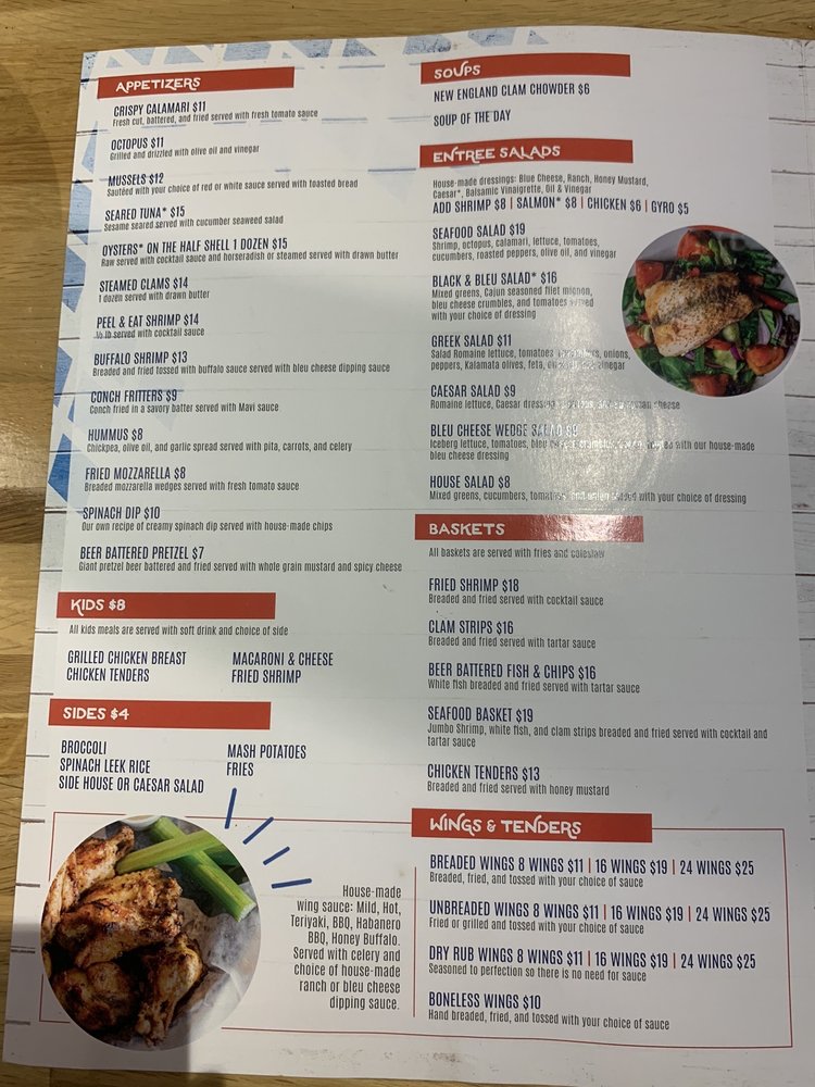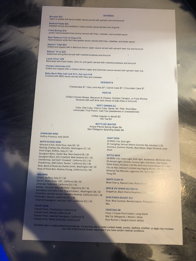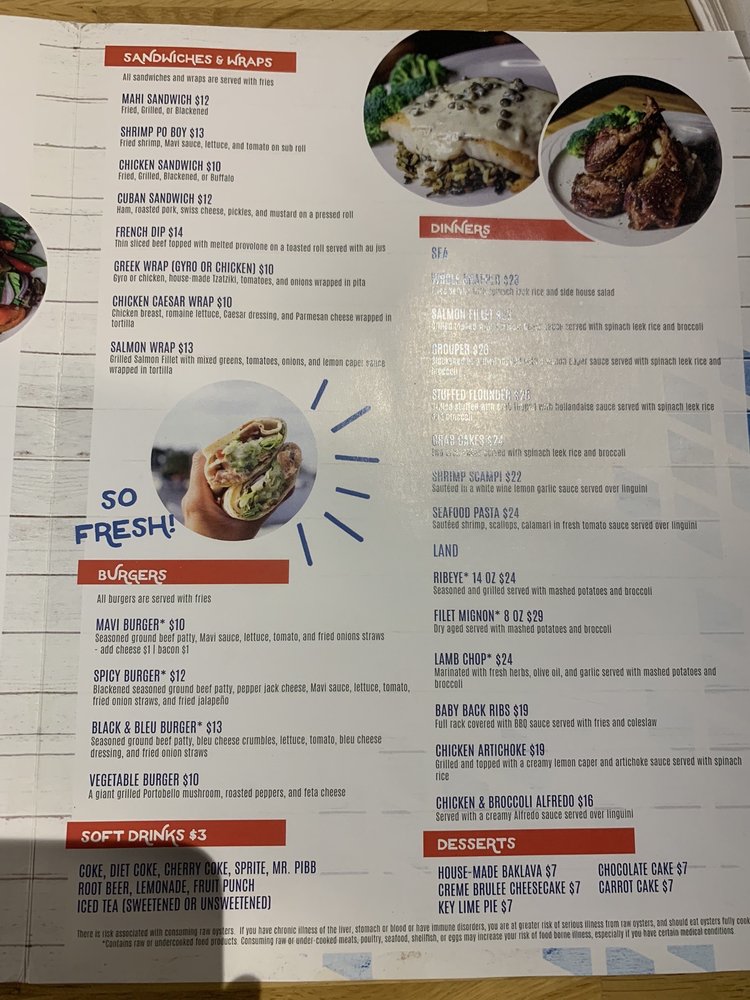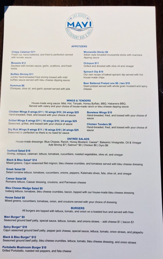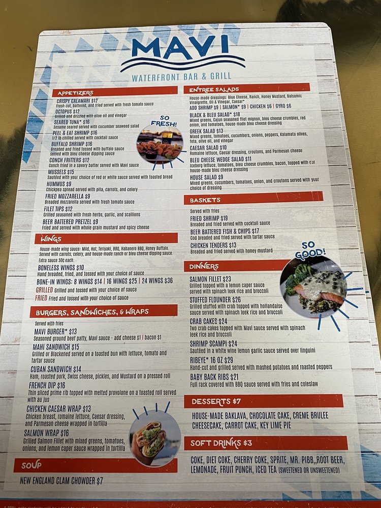 Introducing the menu at Mavi Waterfront Bar & Grill, a popular spot in Jacksonville Beach, FL, offering a mix of burgers, sports bar favorites, and fresh seafood dishes. With options for delivery, takeout, and reservations, this casual and tourist-friendly restaurant provides a range of vegetarian choices and is wheelchair accessible. The outdoor seating boasts stunning water views, making it a perfect spot for dinner or group gatherings. Enjoy live music on Wednesdays and happy hour specials at the full bar. Customers rave about the friendly service, great sunset views, and delicious dishes like prime rib, fish and chips, and calamari. Don't miss out on the waterfront dining experience at Mavi Waterfront Bar & Grill.